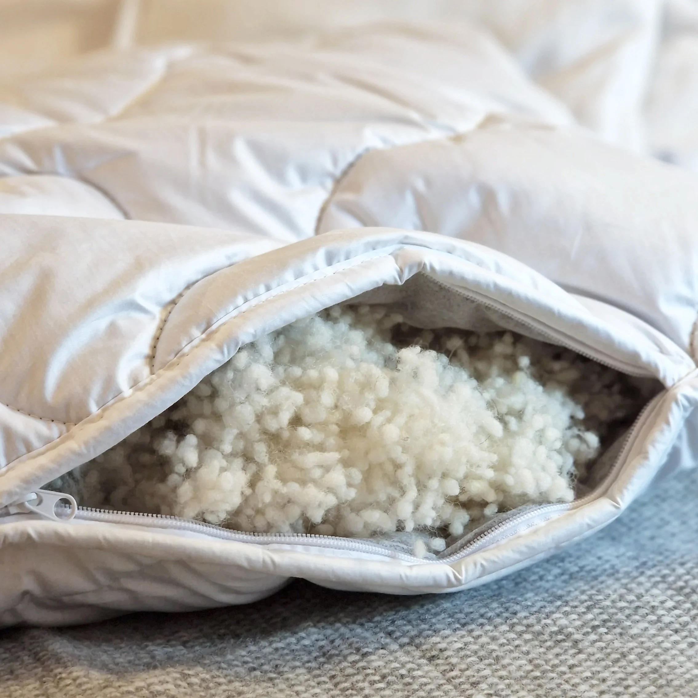 Sheep wool fibre balls - small, fluffy wool clusters used as a natural, breathable filling material.